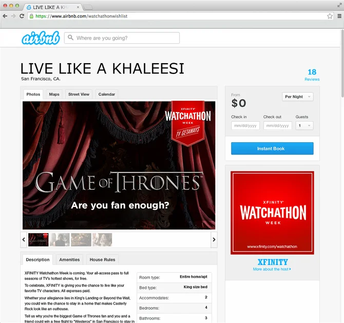 To prepare for "Watchathon Week," a seven-day binge-watching TV event, Xfinity wanted superfans to get even more invested in their favorite shows. So we partnered with Airbnb to let fans actually live like their favorite characters.